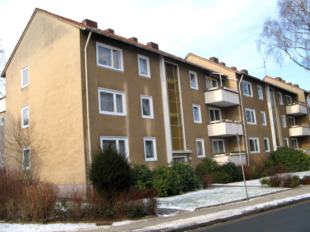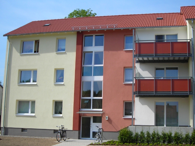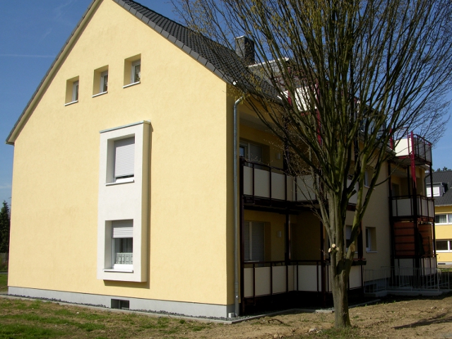 Die Fassaden wurden wärmegedämmt und abschließend mit durchgefärbtem Kratzputz versehen. Die alten Fenster wurden gegen Wärmeschutzfenster ausgetauscht und mit Rollläden ausgestattet. Auch die Wohnungseingangstüren wurden gegen neue ersetzt. In den feststehenden Bereichen der neuen Hauseingangstüren wurden Briefkastenanlagen und Gegensprechanlagen integriert. Die Treppenhäuser wurden malermäßig komplett überarbeitet und mit neuen Leuchten und Licht- und Etagenruftastern ausgestattet.