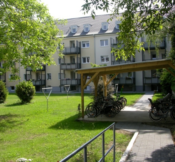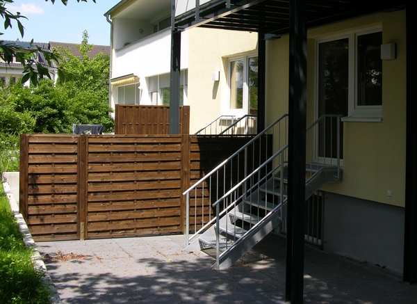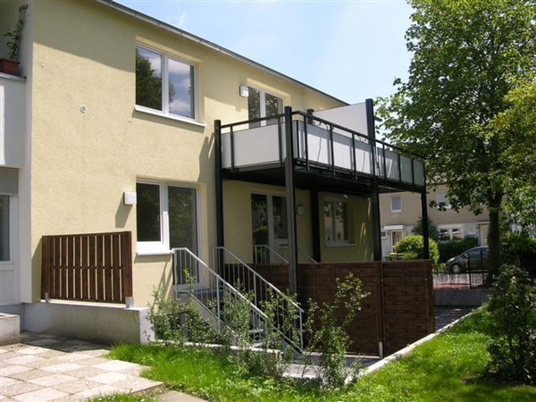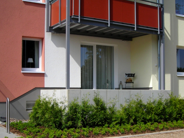 Die alten Balkone wurden abgerissen und durch neue Systembalkone mit Sichtschutz ersetzt. Diese bieten nun mehr Platz zum Verweilen und Erholen. Auch die Rasenfläche lädt zum Verweilen ein. Gepflasterte Wege zum Fahrradunterstand und zum Wäscheplatz. Die Kellerzugänge wurden an die neuen Balkone angepasst. Die alten Kellerverschläge aus Holz wurden komplett entfernt, die neuen Keller werden durch verzinkte Stahlprofile voneinander abgetrennt.
