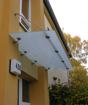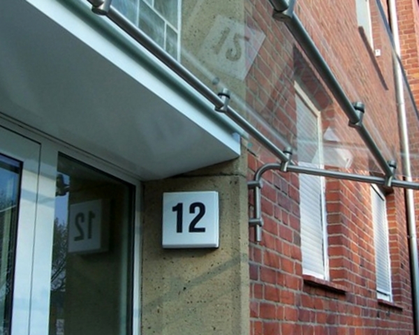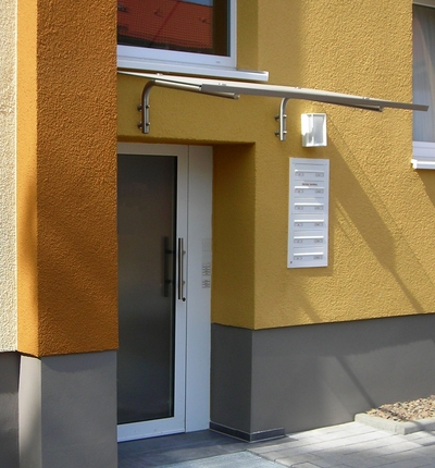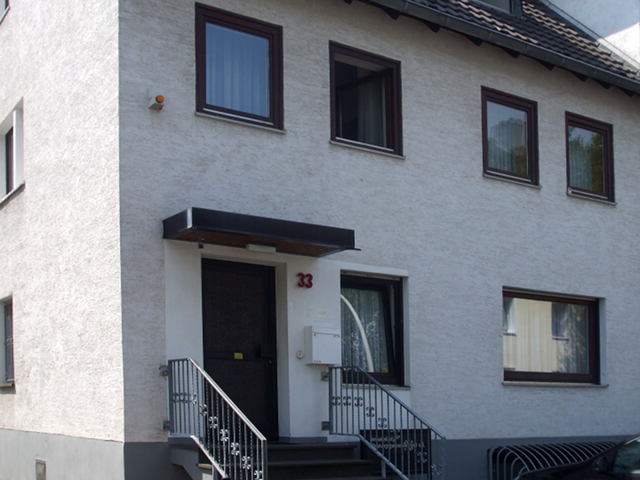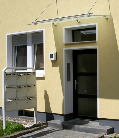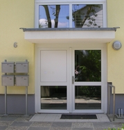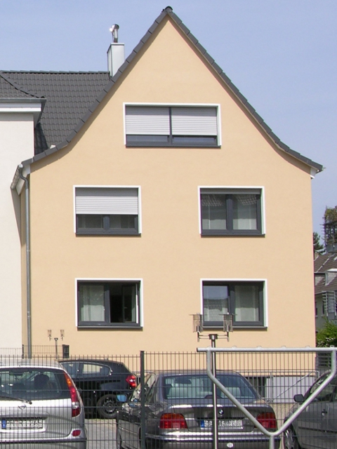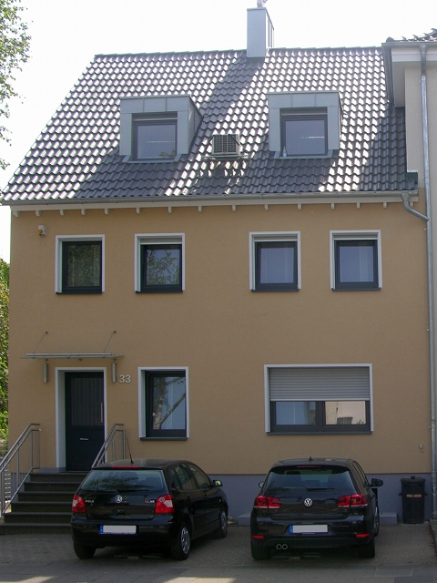 Die alten Fenster wurden gegen Wärmeschutzfenster mit vorgesetzten Rollläden ausgetauscht. Die Hauseingangs- sowie die Kellerausgangstür wurden ausgebaut und durch Aluminiumtüren ersetzt. Den Treppenaufgang zur Hauseingangstür ziert nun ein Treppengeländer aus Edelstahl. Zum Geländer passend wurden Edelstahlleuchten neben der Hauseingangstür angebracht.