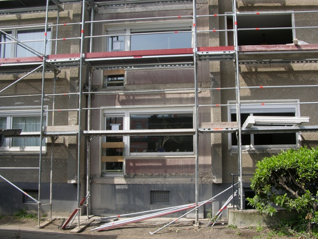 Nach den Bauvorbereitungen wurde die Baumaßnahme im Frühjahr dieses Jahres begonnen. Die Arbeiten an den Häusern beginnen zeitversetzt. Jedoch sind mittlerweile alle Vordächer und Balkone abgebrochen.