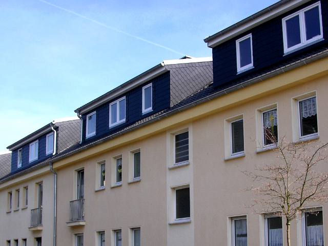 Das Dachgeschoss, inklusive der nicht mehr benötigten Schornsteine, wurde komplett demontiert und entsorgt. Das Dach wurde als Mansardendach neu gestaltet und je Haus wurden 2 neue Dachgeschosswohnungen mit Balkon errichtet. Das Objekt wurde durch die Dämmung der giebelseitigen Fassaden sowie der Kellerdecken energetisch aufgewertet. Abschließend wurden die Wohnungseingangstüren getauscht.